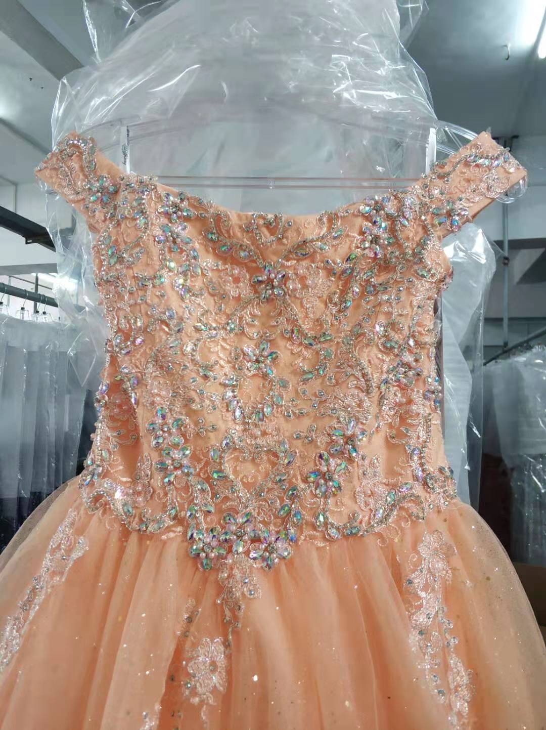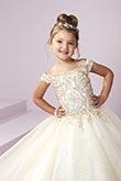 This dress features an off the shoulder neckline, Metallic lace applique� bodice, and a sparkle tulle, A-line skirt. Lace-up back. Tulle/Sparkle Tulle