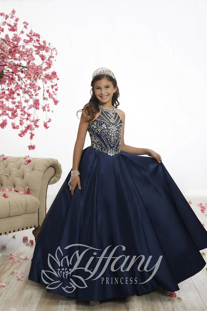 Lovely swirls of baroque beadwork cover this glorious bodice, rising and racing across the halter neckline and straps. Complete with a full box pleated A-line satin skirt. And lace-up back with sweep train.