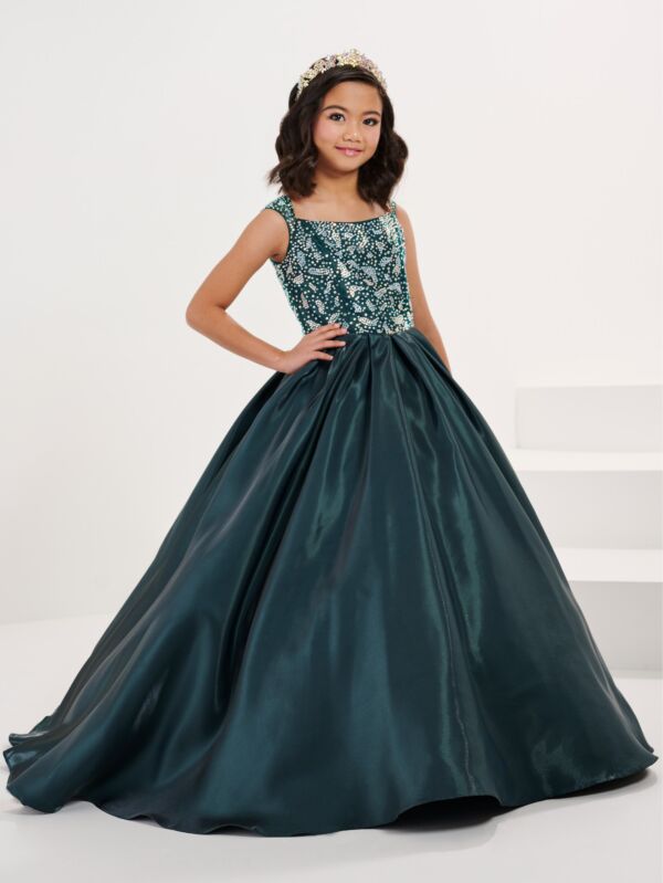 Tiffany Princess by Christina Wu 13697 lilac mini pageant dress features a semi-scoop neckline and illusion straps that segue into the laced-up keyhole back. This shimmer satin ballgown charms with AB stones all over the fitted bodice, finished with a box-pleated skirt and a sweep train.