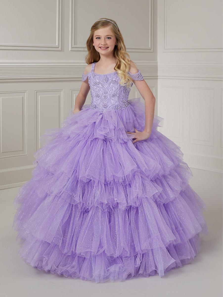 So, in love with this Tiffany Princess by 13716 aqua, lilac, and navy, little girl pageant gown features a fully beaded bodice with a curved square neckline and cold-shoulder sleeves. This sparkle tulle mini ballgown is completed with a multi-tiered skirt, lace-up back, and sweep train.