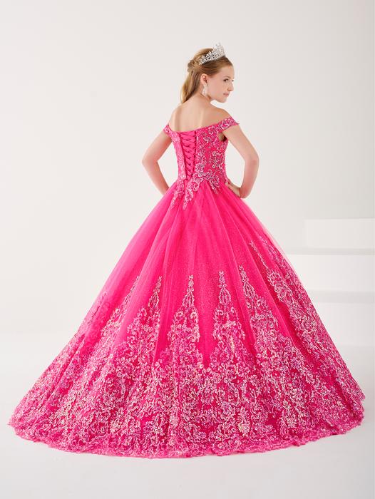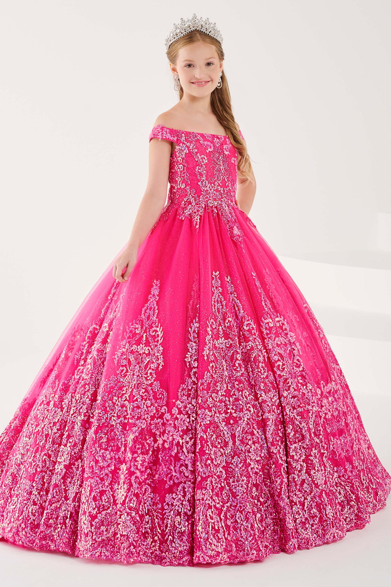 Celebrate your little star’s moment to shine. This scoop-neck ball gown features off-the-shoulder styling, floral glitter details, and a sparkling tulle skirt with train. With its lace-up back and dazzling presence, it’s the gown that turns every step into a magical memory. Help her sparkle with age-appropriate glamour every mom will love.
