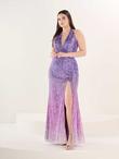 A plunging halter in ombre linear sequin, this gown features a side split and low back.