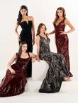 This show-stopping gown features a deep plunging V-neckline with supportive wide straps, creating a bold yet balanced silhouette. The body-hugging mermaid shape sculpts the figure, while the fully sequined design in swirling multi-color patterns adds movement and drama. The intricate embellishment plays with shades of silver, rose, and charcoal over a rich black tulle base, delivering maximum shine under the lights. The long skirt flares just below the knees into a subtle fishtail, offering elegance and ease. From the back, the gown reveals a low scoop open back that adds a sultry finish, showcasing your shoulders and upper back beautifully. The embellishment continues seamlessly throughout the entire gown, ensuring sparkle from every angle. The hemline extends into a modest sweep train, offering a graceful touch as you move.