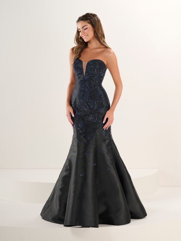 This elegant evening gown features a strapless design with a deep v-neckline, exuding sophistication and grace. The fitted bodice is richly embellished with intricate beadwork and sequins that cascade down to the hips, adding a touch of glamour. From the hips, the skirt flares into a dramatic mermaid silhouette, with scattered beadwork enhancing its shimmering effect.