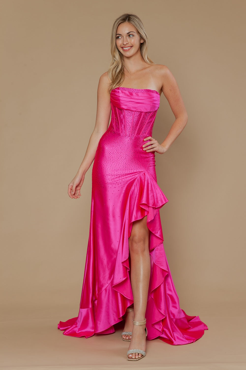 Dazzle at your next event with this strapless gown, adorned with shimmering hot fix embellishments that catch the light beautifully. The structured corset bodice offers both support and a flattering fit, while the skirt showcases a ruffle trim that adds a playful touch to the classic sheath silhouette. A strategically placed high slit enhances the gown allure, making it a perfect choice for those looking to combine elegance with a hint of drama.