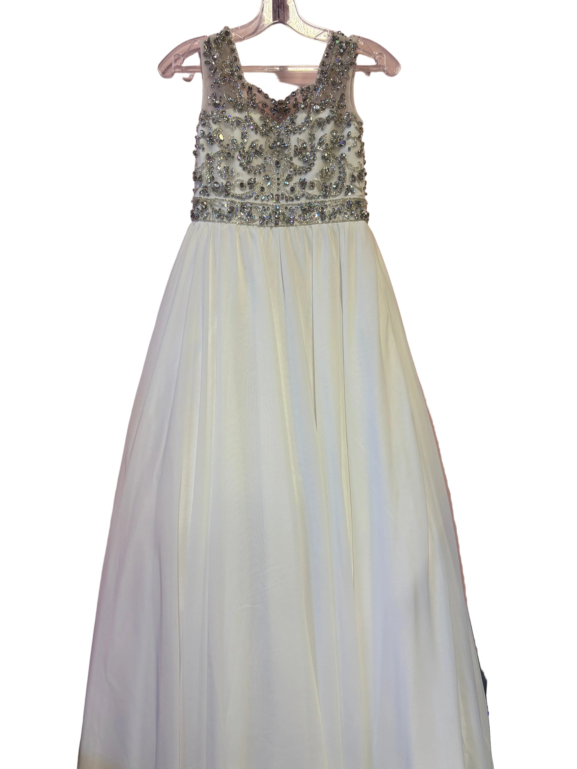The Ava Presley 27722 long gown combines a classic silhouette with youthful elegance, perfect for a pageant or formal occasion. The intricately beaded bodice and cap sleeves add a regal touch, while the flowing skirt creates a graceful and timeless look. This dress is designed to make any young girl feel like a princess at her special event.