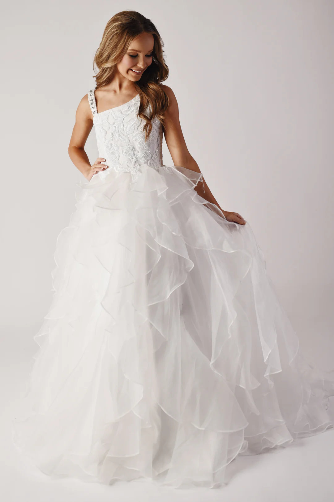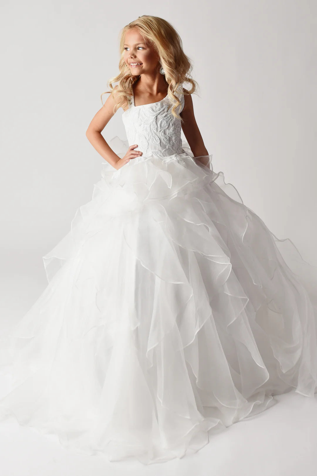The Ava Presley 27726 design is a dreamy choice for young fashionistas, offering a beautiful combination of a shimmering fitted bodice and a voluminous layered skirt. The cascading ruffles and playful silhouette make it an enchanting pick for pageants or special occasions. With intricate details and a twirl-worthy style, this long dress is perfect for making memories in a magical way.