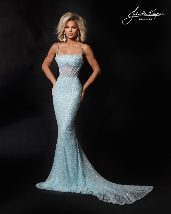 All eyes will be on you in this beaded stretch mesh gown with corset-style bodice. The radiate sparkle and flattering fit and flare silhouette make it a total prom-night or teen pageant show stopper. |