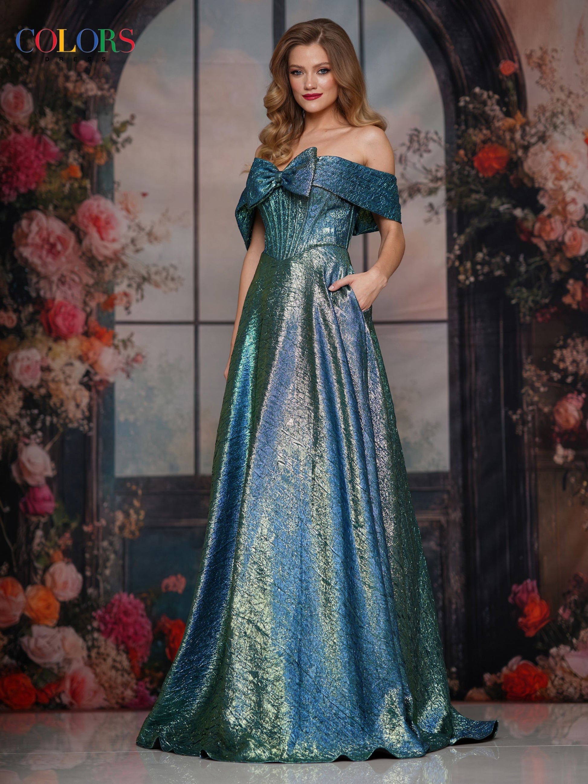 A metallic jacquard gown featuring an off the shoulder sweetheart bodice, statement front bow, flowy skirt.