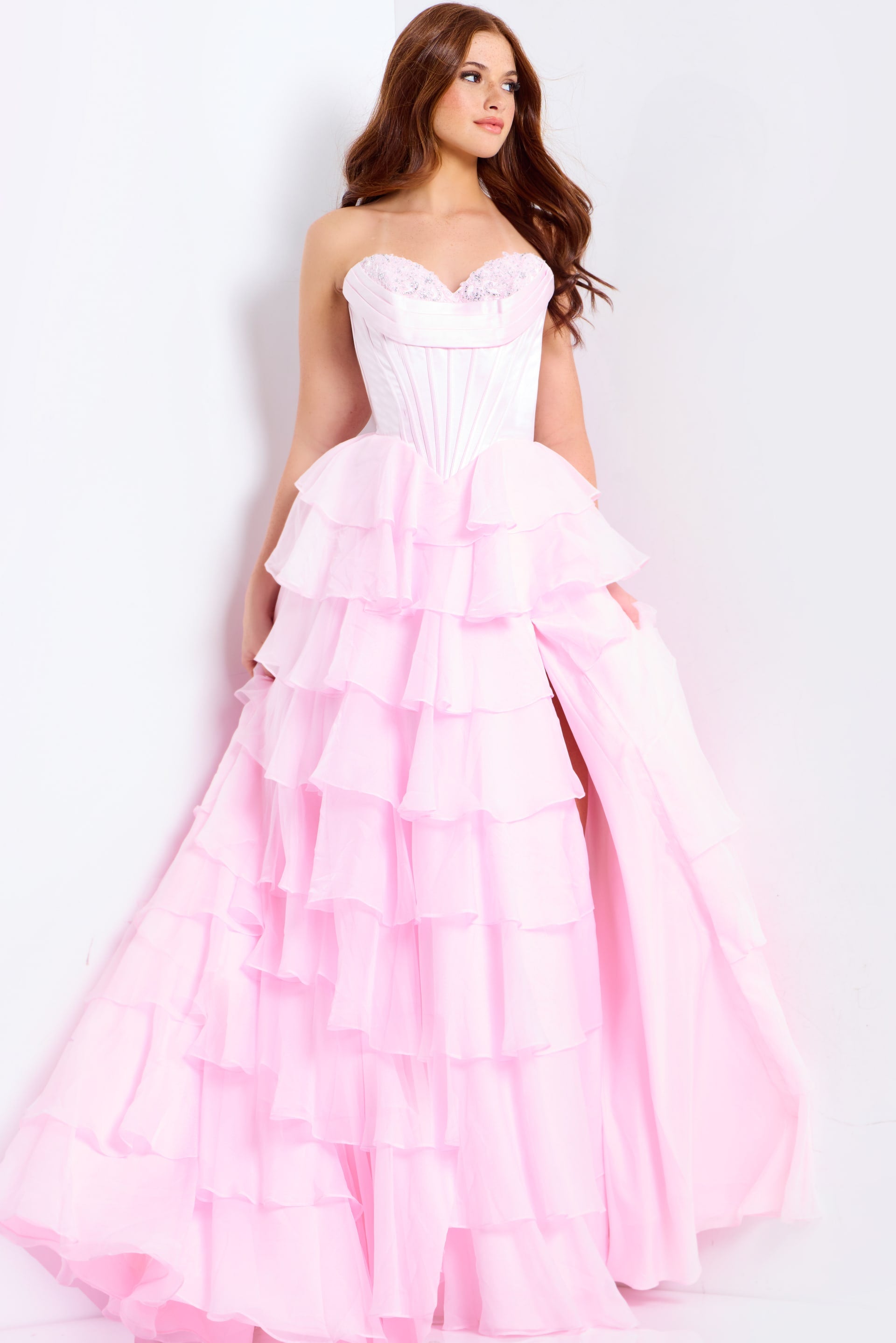 Whimsical layers meet structured elegance in Jovani 47762, a captivating ballgown that celebrates feminine charm. Its corset-style bodice sculpts the torso while the strapless sweetheart neckline enhances delicate appeal. Flowing into cascading ruffles, the skirt moves with volume and grace, revealing a daring slit that adds a modern edge. The play of textures creates a captivating balance of form and freedom, allowing Jovani 47762 to embody both refinement and joyful movement for any grand occasion. Model is wearing Pink color.