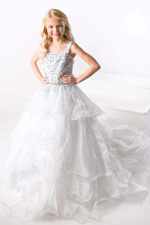 This long gown is designed for the little girl who loves to shine at every special occasion. Featuring a fully embellished bodice with intricate beadwork and a voluminous sparkling tulle skirt, this dress creates a dazzling, princess-worthy look. With its flattering V-neckline and detailed waistline, it’s perfect for pageants or any event where she wants to feel extra glamorous.