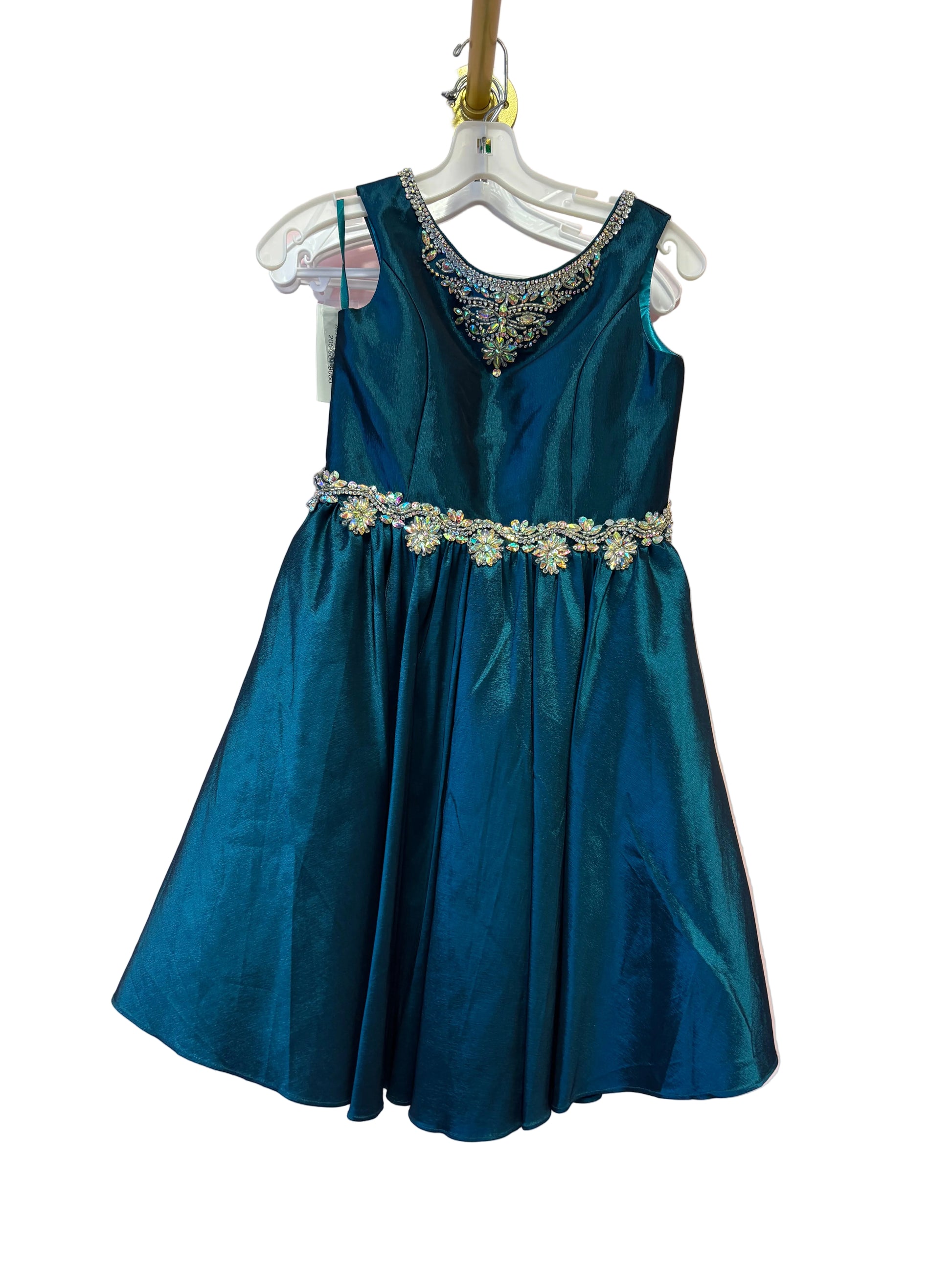 The fabric in this Little Rosie Long Pageant Dresses style is Chiffon, taffeta, embellished with beading at the top and around the waist.