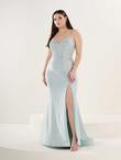 Turn heads in this jaw-dropping full-length gown, made from a luxe shimmer jersey fabric that hugs your curves and reflects light from every angle. The fitted bodice features a flattering v-neckline with thin spaghetti straps, while radiant, rhinestone-encrusted lines fan out across the entire dress, emphasizing your shape with dramatic detail. The gown includes a high side slit, adding a bold, sultry finish to this elegant look. The back of the dress is designed for understated elegance with a modest scoop and continued radiant beading that draws the eye. The shimmer jersey flows into a sleek mermaid-style train that enhances movement and allure without overwhelming your figure.