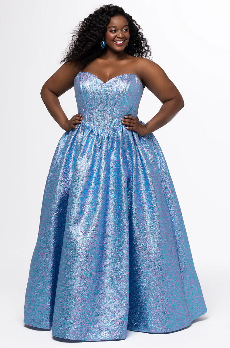 Step into the spotlight in the breathtaking Sydney’s Closet TE2538 Metallic Ball Gown. Crafted from shimmering metallic brocade, this strapless beauty features a modified sweetheart neckline and exposed corset boning for a flattering, structured fit. The basque waistline enhances your curves, while the dramatic ball gown skirt ensures a show-stopping entrance. A lace-up back with a modesty panel adds elegance, and yes—it even has pockets! Perfect for prom or any grand event.